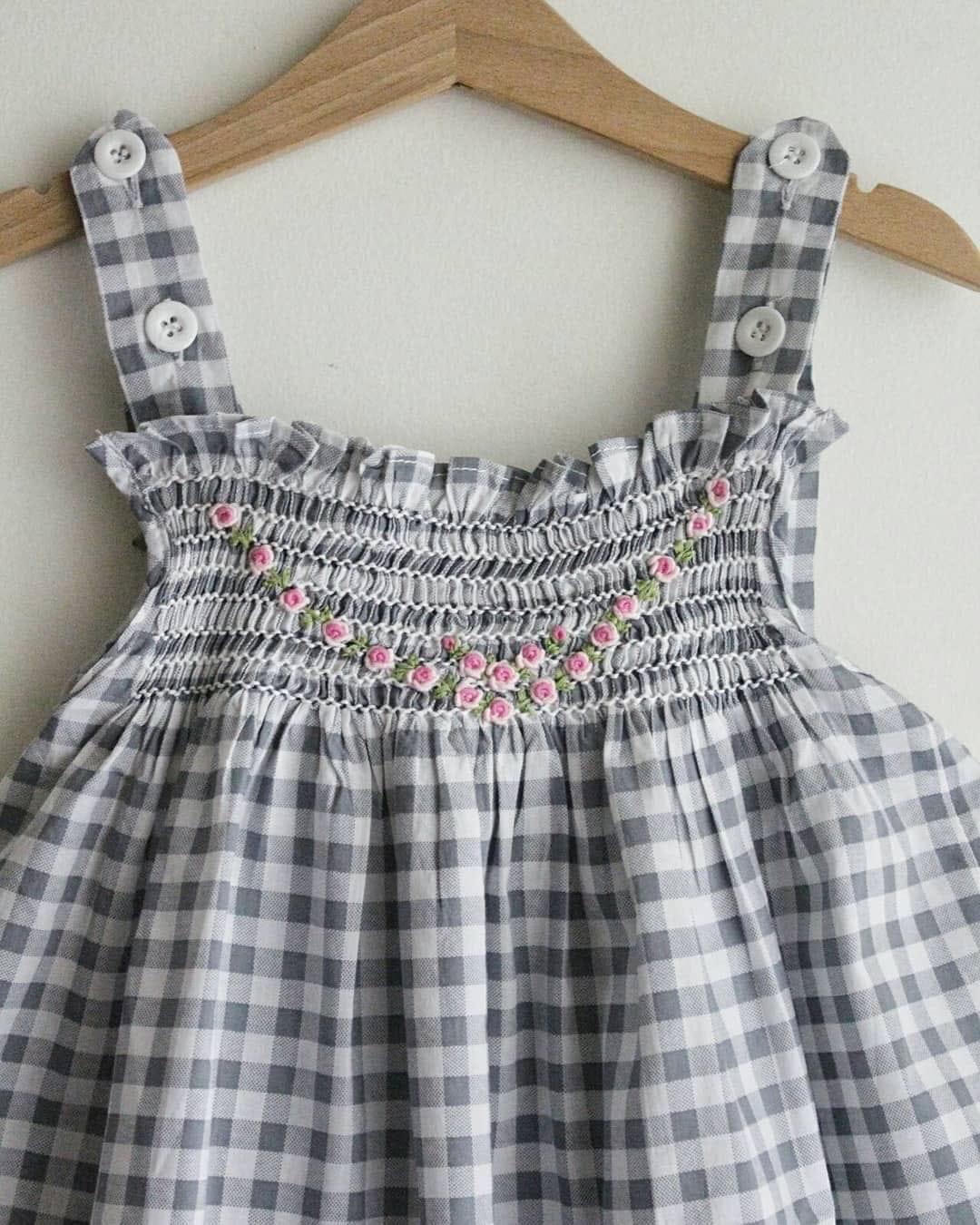 Hand smocked dress with floral printed fabric, Beautiful han-smocked panels with delicate embroidery details. Please note that smocked patterns may vary due to the handmade nature of garment.